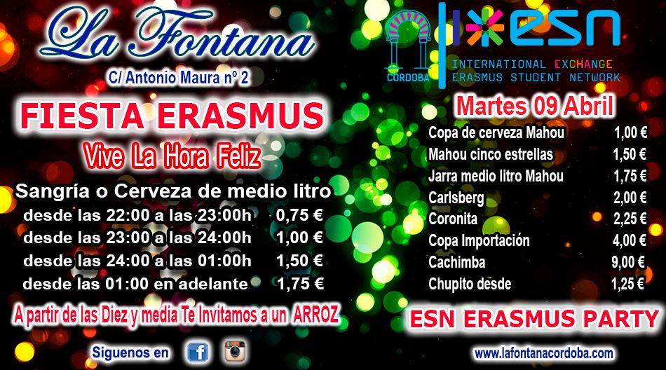 Martes 9 de Abril…¡FIESTA ERASMUS! ¡VIVE LA HORA FELIZ! Sangría o cerveza de medio litro desde las 22:00 a las 23:00h 0,75€ desde las 23:00 a las 24:00h 1,00€ desde las 24:00 a las 01:00h 1,50€ desde las 01:00 en adelante 1,75€