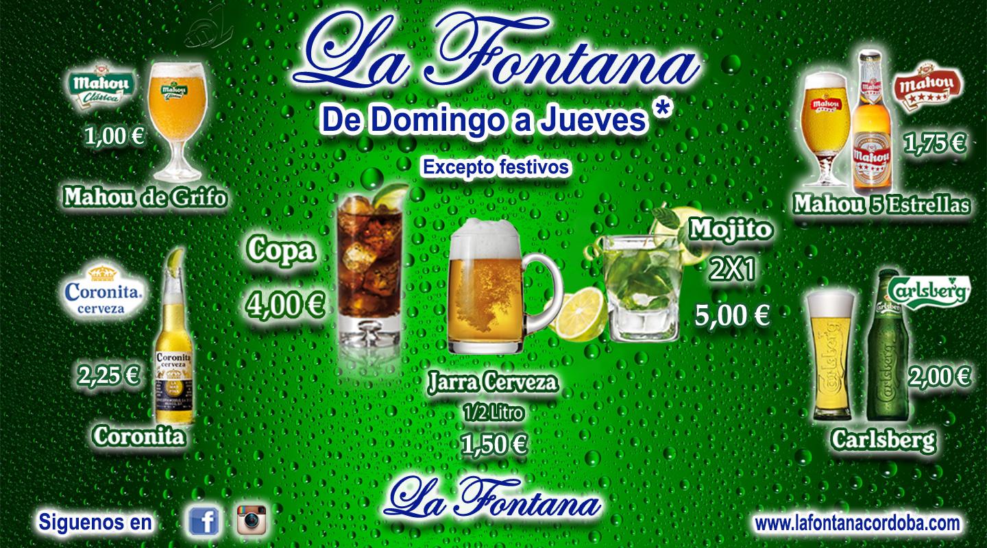 Disfruta en la Fontana Córdoba de Domingo a Jueves de estos precios (Excepto los festivos): Mahou de grifo 1,00€ Coronita 2,25€ Copa 4,00€ Jarra de cerveza 1/2Litros 1,50€ Mojito 2×1 5,00€ Mahou 5 Estrellas 1,75€ Carlsberg 2,00€