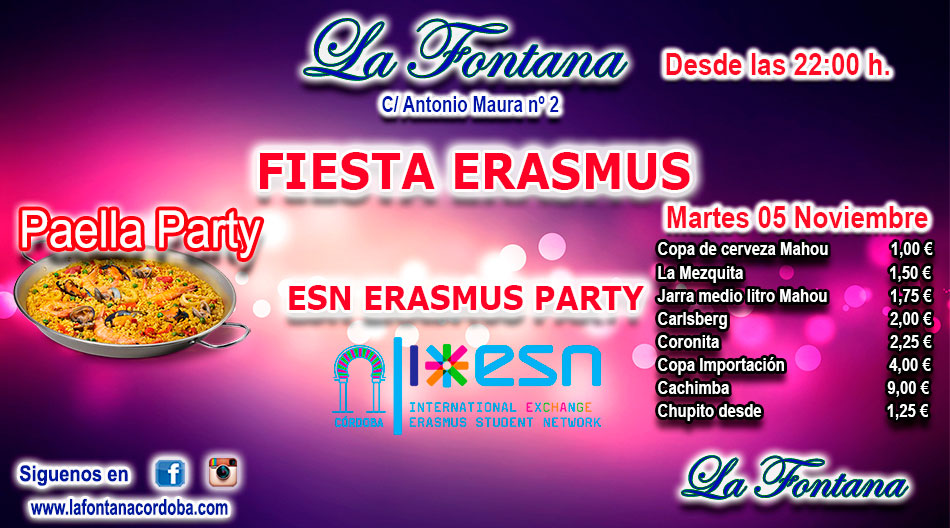 Martes 5 de Noviembre…¡FIESTA ERASMUS! – Paella Party desde las 22:00h – Copa de cerveza Mahou 1,00€ La Mezquita 1,50€ Jarra 1/2Litros Mahou 1,75€ Carlsberg 2,00€ Coronita 2,25€ Copa Importación 4,00€ Cachimba 9,00€ Chupito desde 1,25€