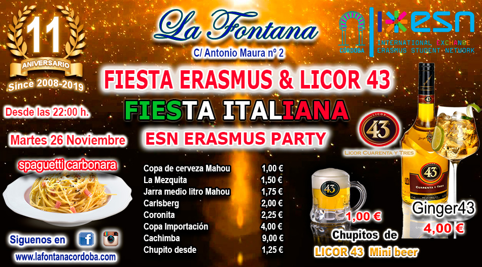 Martes 26 de Noviembre…¡FIESTA ITALIANA! FIESTA ERASMUS & LICOR 43 Copa de cerveza Mahou 1,00€ Mahou 5 Estrellas 1,50€ Jarra 1/2Litros Mahou 1,75€ Carlsberg 2,00€ Coronita 2,25€ Copa Importación 4,00€ Cachimba 9,00€ Chupito desde 1,25€ www.lafontanacordoba.com