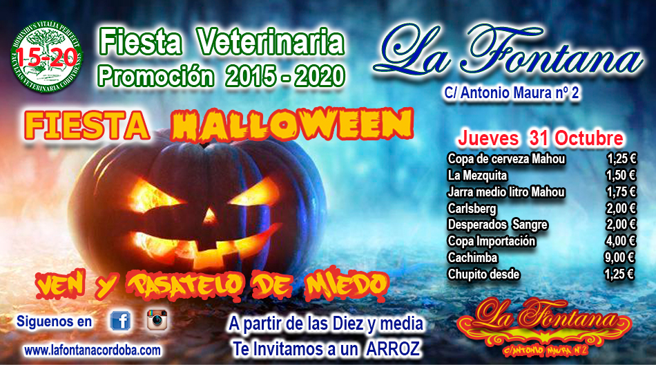 Jueves 31 de Octubre…¡FIESTA VETERINARIA! Promoción 2015 – 2020 Copa de cerveza Mahou 1,25€ La Mezquita 1,50€ Jarra 1/2 Litros Mahou 1,75€ Carlsberg 2,00€ Desperados Sangre 2,00€ Copa Importación 4,00€ Cachimba 9,00€ Chupito desde 1,25€